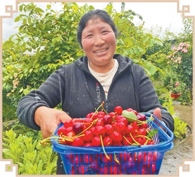 村民在展示從自家庭院中采收的櫻桃。黃海芬攝