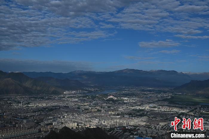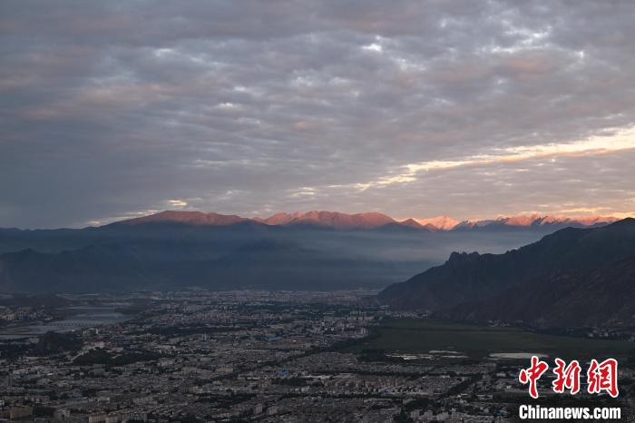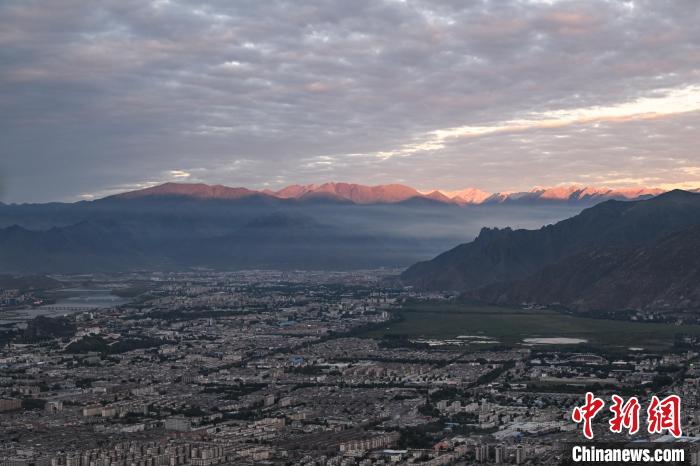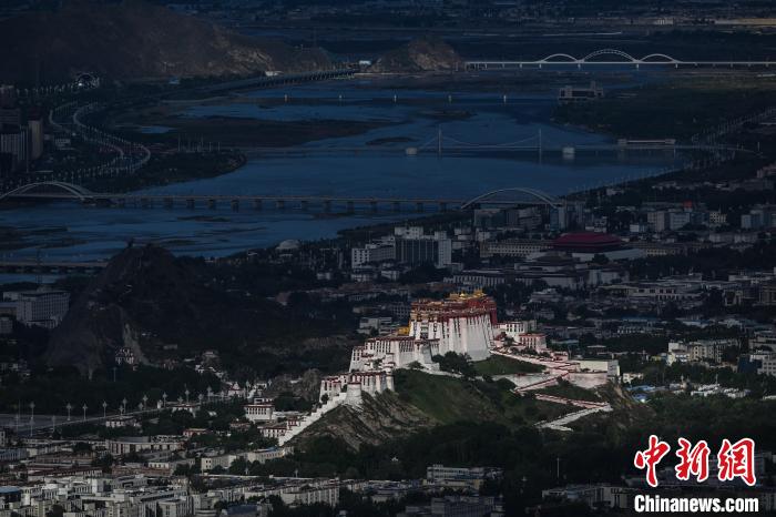 7月5日清晨,西藏拉薩市在薄霧中朦朧蘇醒,天際線泛起粉紫色霞光。布達拉宮在朝陽的映照下美景如畫。中新社記者 貢嘎來松 攝