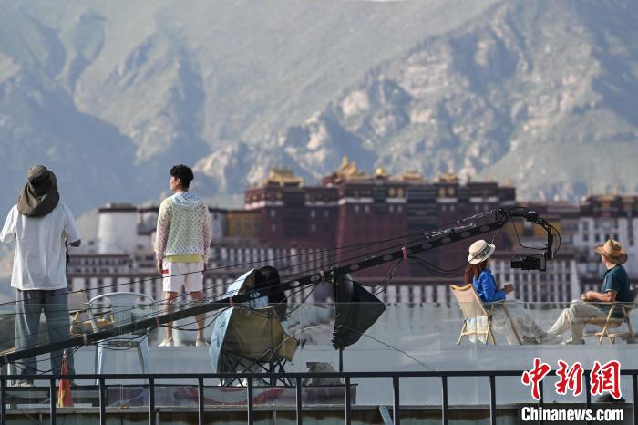 7月7日,游客在西藏拉薩市的一家景觀咖啡廳拍攝以布達(dá)拉宮為背景的 “旱地拔蔥” 。中新社記者 貢嘎來(lái)松 攝