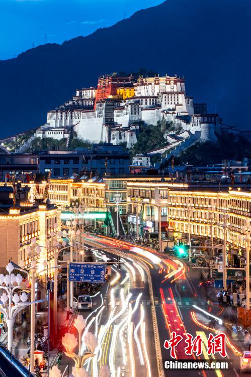 7月14日晚,在西藏拉薩,亮燈后的布達(dá)拉宮與北京東路交相輝映,夜色璀璨奪目。中新社記者 張祥毅 攝