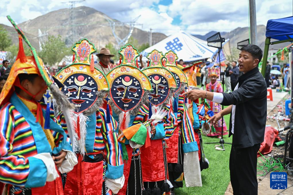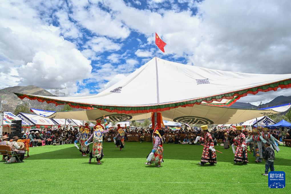 7月16日,民間藏戲表演隊在南木林縣非遺公園內表演湘巴藏戲。新華社記者 李鑫 攝