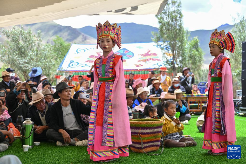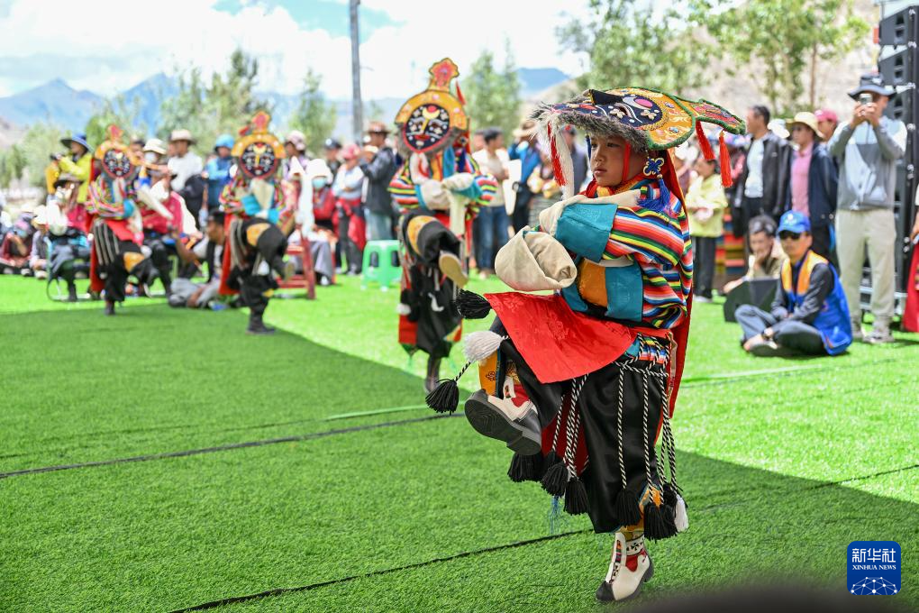 7月16日,果拉村少兒藏戲隊的小演員在南木林縣非遺公園內表演湘巴藏戲。新華社記者 李鑫 攝