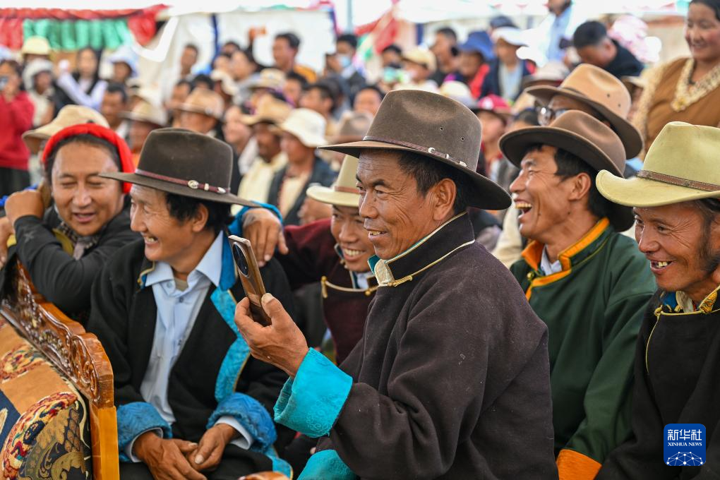 7月16日,群眾在南木林縣非遺公園內觀看藏戲表演。新華社記者 李鑫 攝