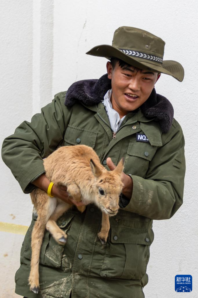 措羅木管理站站長阿旺洛卓在給藏羚羊幼崽喂奶(7月16日攝)。新華社記者 姜帆 攝?
