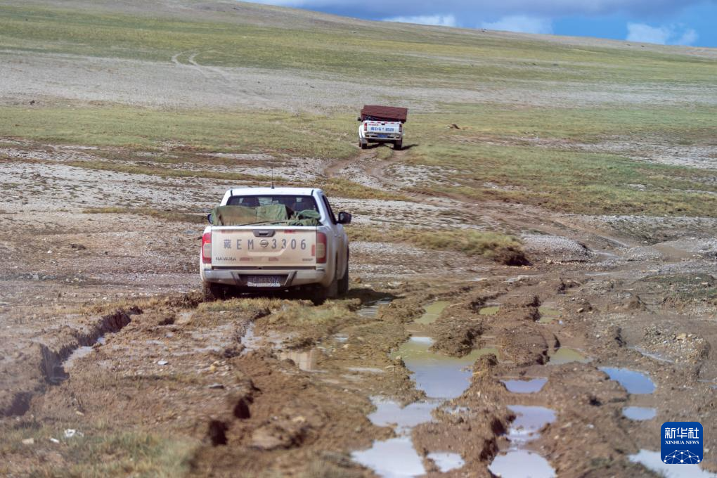 措羅木管理站的野生動物管護(hù)員驅(qū)車前往無人區(qū)深處的森隆藏布河畔(7月14日攝)。新華社記者 姜帆 攝