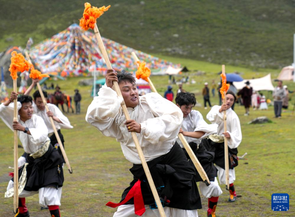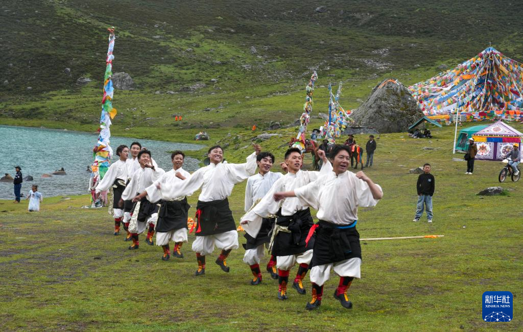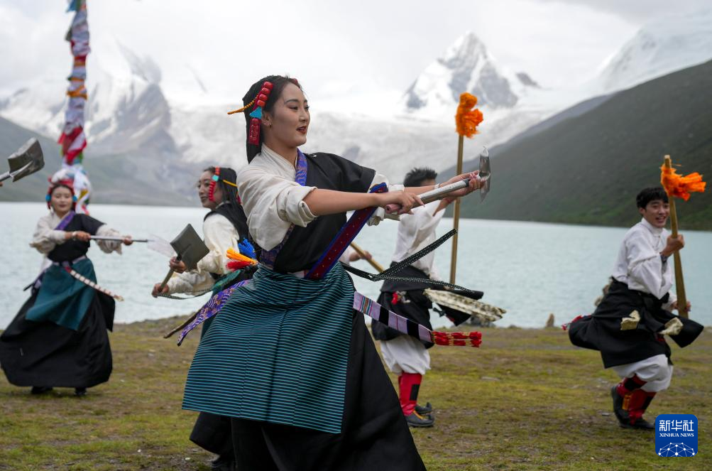 西藏那曲市比如縣藝術(shù)團(tuán)的演員在薩普雪山景區(qū)為游客表演國家級非物質(zhì)文化遺產(chǎn)舞蹈“達(dá)布阿諧”(7月19日攝)。這是該藝術(shù)團(tuán)今年在景區(qū)開展的第6場非遺展演活動。新華社記者 晉美多吉 攝