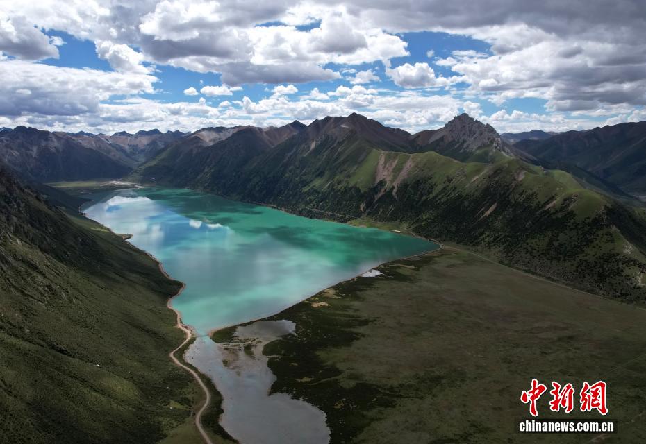 7月21日,嘉乃玉錯(cuò)景色。嘉乃玉錯(cuò)國家濕地公園位于西藏那曲市嘉黎縣境內(nèi)。夏日,嘉乃玉錯(cuò)碧波蕩漾,湖邊綠意盎然,在藍(lán)天白云映襯下,景色如畫。(無人機(jī)照片)中新社記者 李林 攝