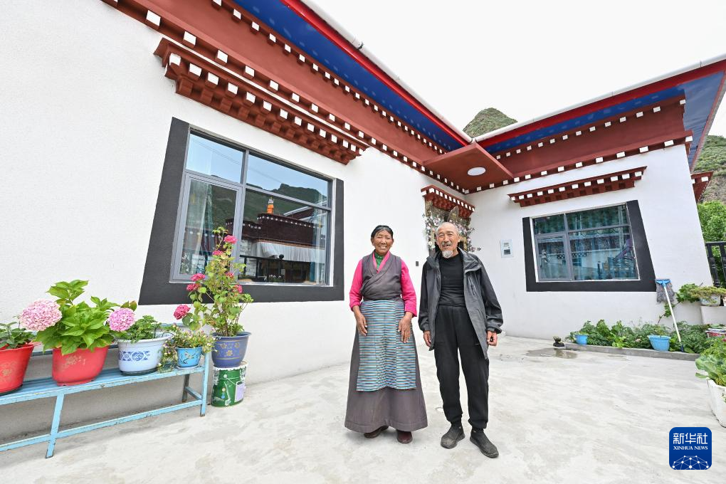 7月21日,拉丁雪村74歲的扎西歐珠(右)和73歲的老伴索朗玉珍站在自家的新房前合影。新華社記者 晉美多吉 攝