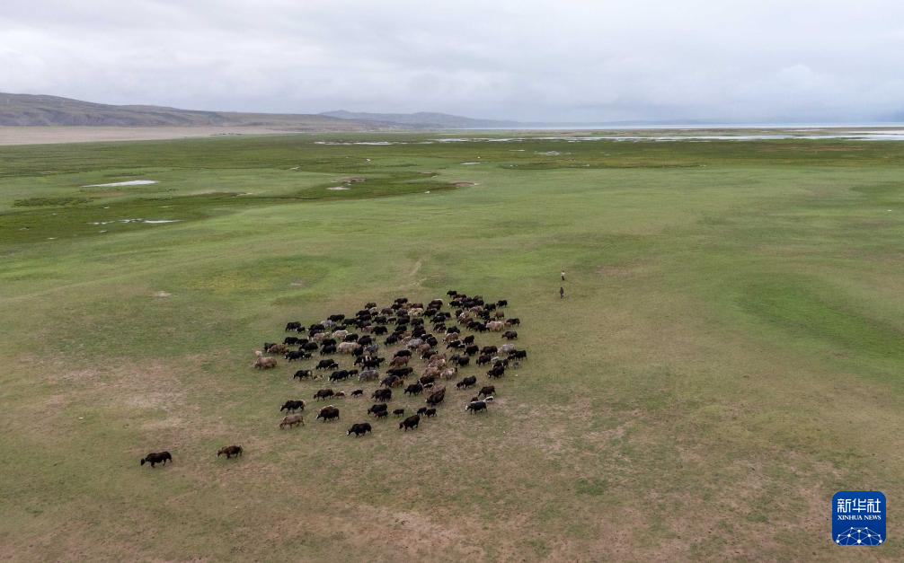 7月22日拍攝的瑪旁雍錯濕地上的牦牛(無人機(jī)照片)。新華社記者 旦增尼瑪曲珠 攝