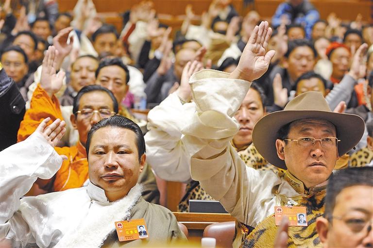 在舊西藏,占總?cè)丝诓坏?%的三大領(lǐng)主(官家、貴族和寺院上層僧侶)占有全部生產(chǎn)資料,而占總?cè)丝?5%以上的農(nóng)奴和奴隸沒有人身自由。西藏民主改革特別是西藏自治區(qū)成立以來,民族區(qū)域自治制度得到堅決貫徹,各族人民參與民主政治建設(shè)的熱情持續(xù)高漲:農(nóng)奴的后代當(dāng)選人大代表,通過人民代表大會制度參與國家治理;截至目前,全區(qū)四級人大代表42000余人中,藏族和其他少數(shù)民族約占89%;門巴、珞巴等人口不足萬人的民族,在全國及西藏人大均有代表——雪域高原各族兒女依法行使民主權(quán)利,真正成為命運的主宰者。