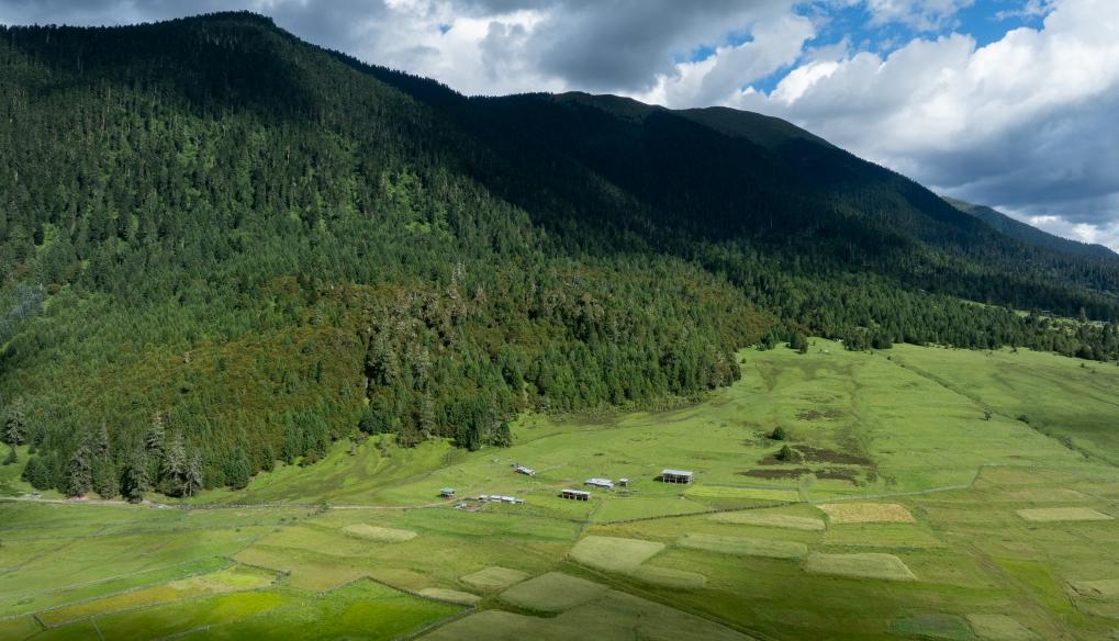 俯瞰扎西崗村旁的花海牧場(chǎng)(無(wú)人機(jī)照片)。新華社記者 丁增尼達(dá) 攝