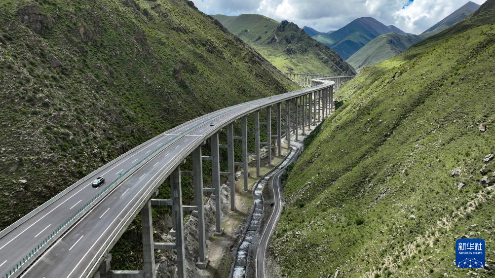 汽車行駛在西藏S5線拉薩至澤當的高等級公路上(無人機照片,2025年7月31日攝)。新華社記者 晉美多吉 攝