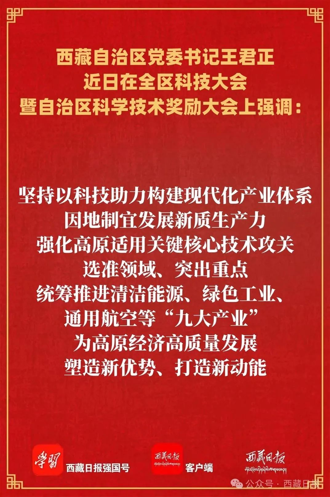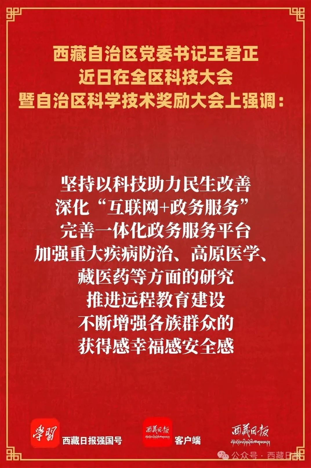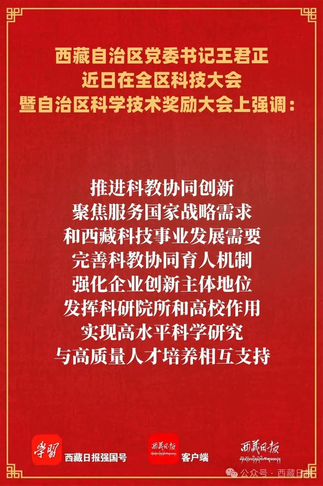 近日,全區(qū)科技大會(huì)暨自治區(qū)科學(xué)技術(shù)獎(jiǎng)勵(lì)大會(huì)在拉薩召開(kāi),自治區(qū)黨委書記王君正出席并講話。他強(qiáng)調(diào),要深入貫徹落實(shí)習(xí)近平總書記關(guān)于科技創(chuàng)新、西藏工作的重要指示和新時(shí)代黨的治藏方略,加快推動(dòng)科技事業(yè)發(fā)展,為社會(huì)主義現(xiàn)代化新西藏建設(shè)提供堅(jiān)實(shí)科技支撐。