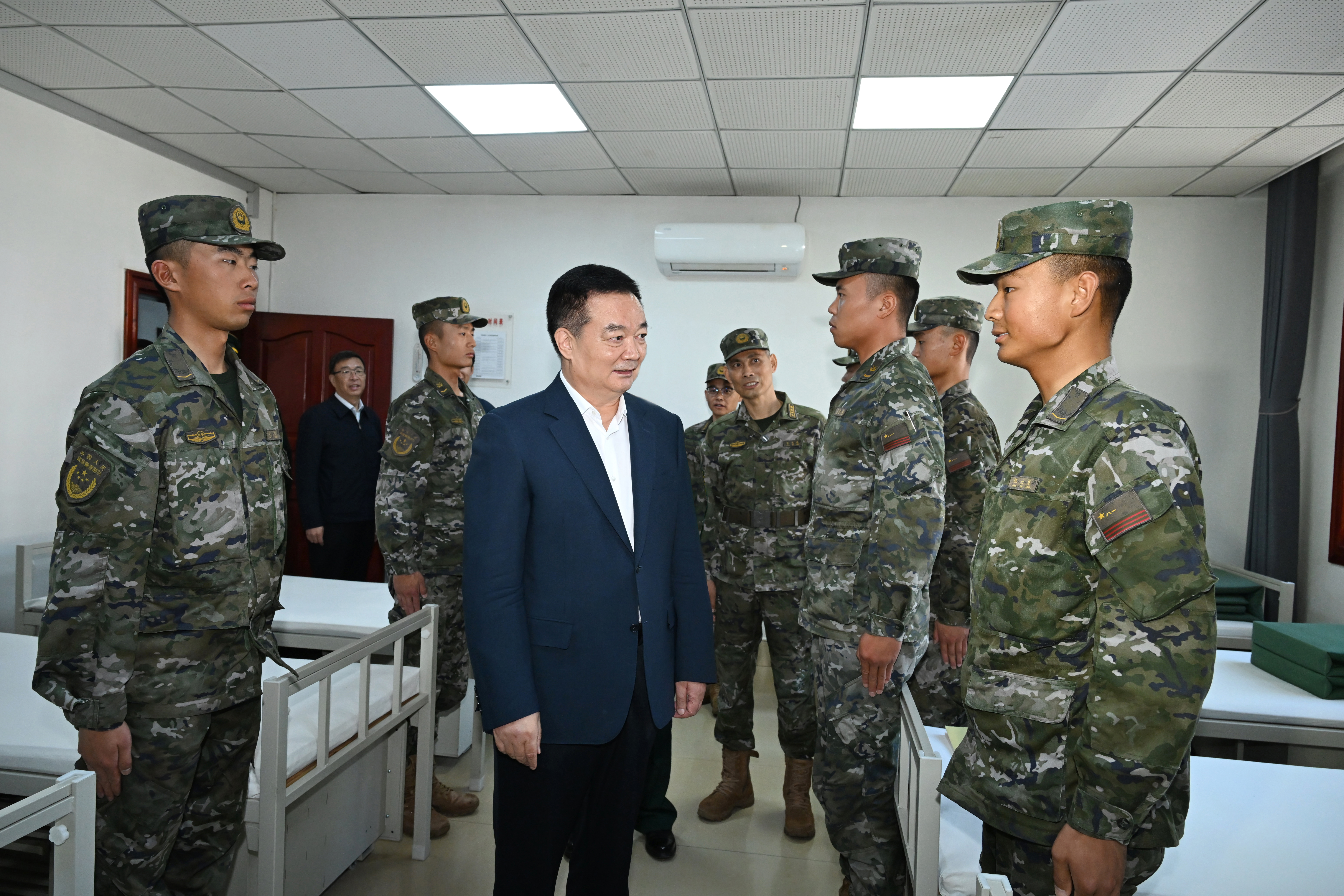 八一建軍節(jié)來(lái)臨之際,7月31日,自治區(qū)黨委書記、西藏軍區(qū)黨委第一書記王君正在拉薩看望慰問(wèn)駐藏部隊(duì)官兵。這是王君正在武警西藏總隊(duì)某中隊(duì)了解官兵生活情況。記者 李洲 攝