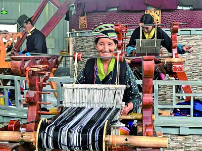 西藏山南市乃東民族嘩嘰手工編織專業(yè)合作社內(nèi),村民們正在編織純手工的澤帖爾。光明日?qǐng)?bào)記者 李丹陽(yáng)攝/光明圖片