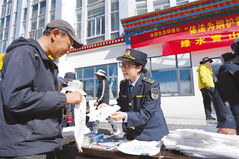 在法規(guī)宣講環(huán)節(jié),工作人員通過(guò)設(shè)立宣傳展板、懸掛宣傳橫幅、發(fā)放政策法規(guī)手冊(cè)、現(xiàn)場(chǎng)接受群眾咨詢答疑等形式,向群眾集中宣傳《中華人民共和國(guó)青藏高原生態(tài)保護(hù)法》及自治區(qū)實(shí)施辦法等生態(tài)環(huán)保法律法規(guī)。