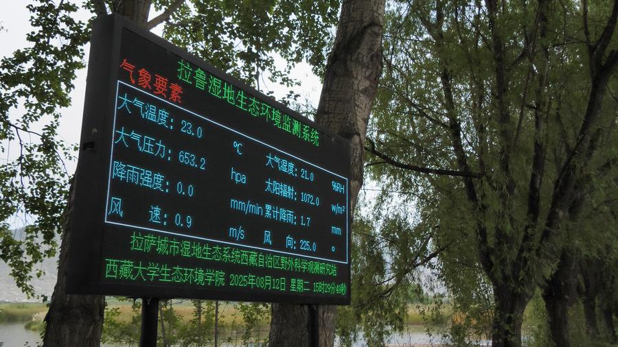 拉魯濕地國家級自然保護(hù)區(qū)南門內(nèi)的生態(tài)環(huán)境監(jiān)測系統(tǒng)顯示屏,實(shí)時顯示濕地內(nèi)的氣象要素、土壤和水環(huán)境、植被指數(shù)等數(shù)據(jù)。新華社記者 黃智琪 攝