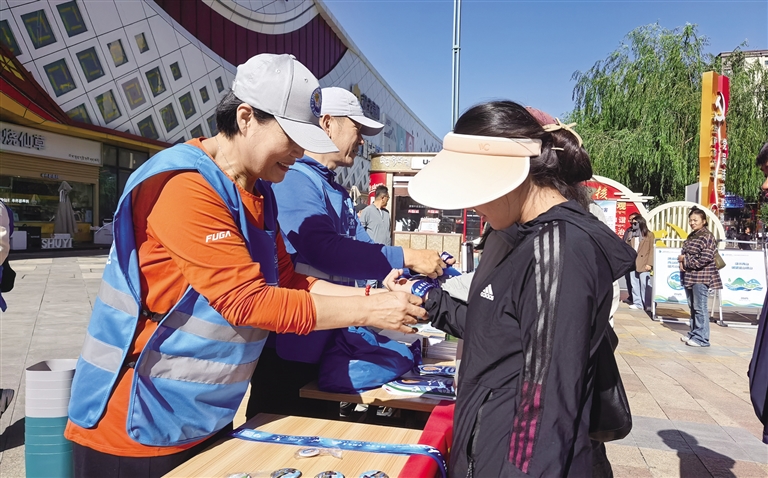 志愿者為市民系上象征保護生態(tài)環(huán)境的藍絲帶。