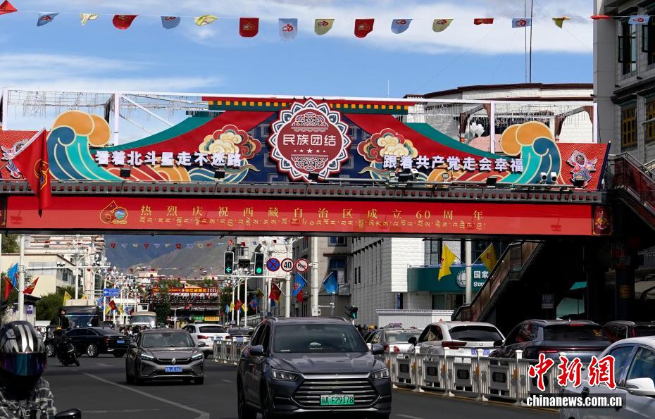 8月19日,隨著西藏自治區(qū)成立60周年慶祝活動(dòng)臨近,拉薩氛圍濃。拉薩街頭,處處是張燈結(jié)彩的盛景,洋溢著一派祥和與歡騰的氛圍。圖為拉薩裝扮一新的人行天橋。中新社記者 李林 攝