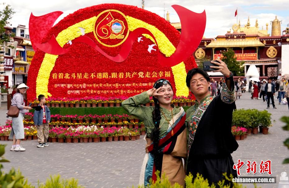8月19日,隨著西藏自治區(qū)成立60周年慶祝活動(dòng)臨近,拉薩氛圍濃。拉薩街頭,處處是張燈結(jié)彩的盛景,洋溢著一派祥和與歡騰的氛圍。圖為游客在拉薩大昭寺廣場(chǎng)上的大慶宣傳標(biāo)語(yǔ)前留念。中新社記者 李林 攝