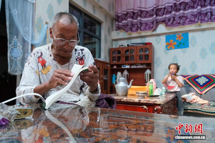 圖為8月12日,達瓦次仁在森布日的家中翻看藏歷,回憶在雙湖的經(jīng)歷,他的身后是他的外孫女。江飛波 攝