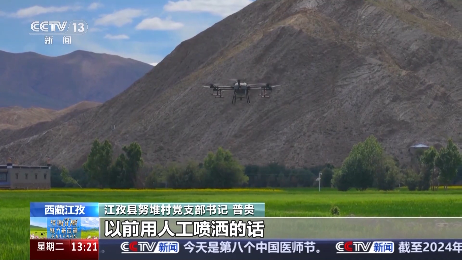 西藏日喀則市江孜縣努堆村黨支部書記 普貴:這幾天我們正在給青稞噴灑葉面肥,以前人工噴灑,一畝地需要半小時左右?,F(xiàn)在用無人機(jī),半小時能噴灑30多畝地,我們村的2500多畝地大概需要兩天就能完成。