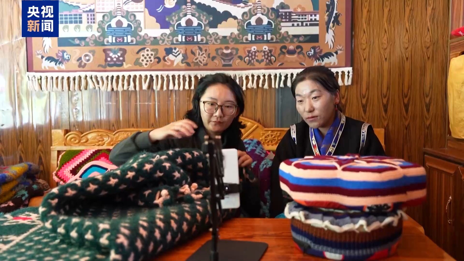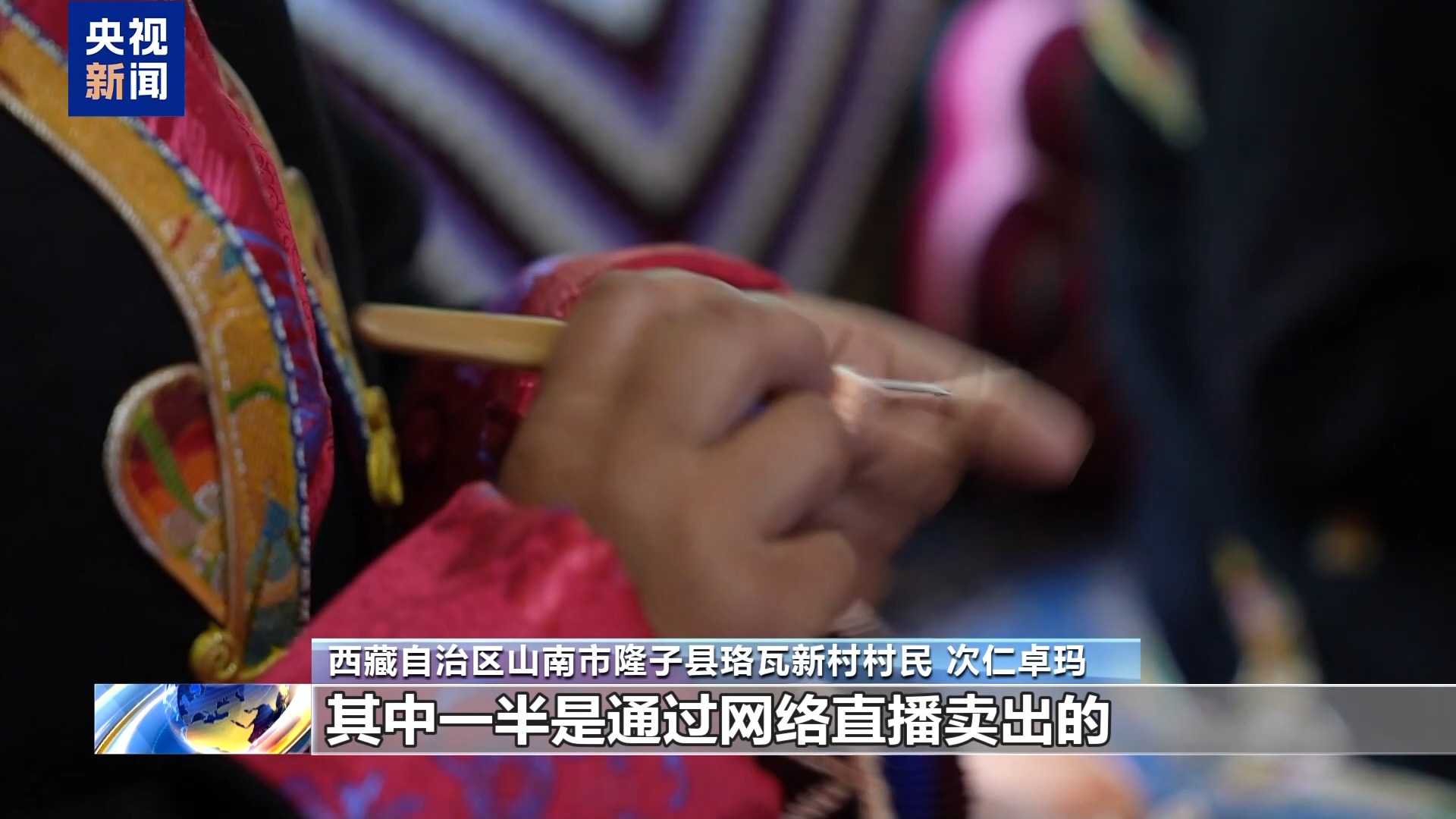 西藏自治區(qū)山南市隆子縣珞瓦新村村民 次仁卓瑪:今年以來,我們已經(jīng)賣出了50多條毛毯,100多個靠枕,其中一半是通過網(wǎng)絡(luò)直播賣出的。
