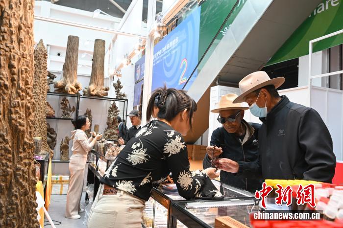2025年5月16日,2025第二屆拉薩進(jìn)口商品展覽會(huì)在西藏會(huì)展中心舉行。圖為越南商人(左)向顧客推銷佛珠。中新社記者 貢嘎來松 攝