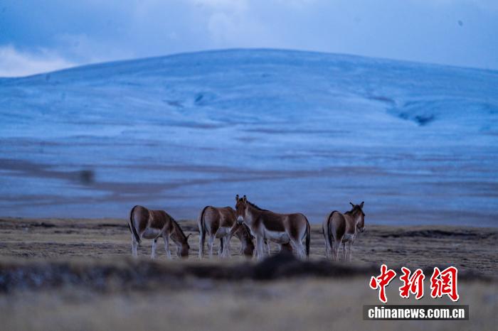 2024年10月23日,中國(guó)國(guó)家一級(jí)保護(hù)動(dòng)物藏野驢在西藏自治區(qū)那曲市安多縣多瑪鄉(xiāng)境內(nèi)的草原上覓食、嬉戲。中新社記者 貢嘎來(lái)松 攝