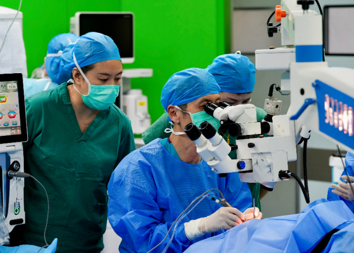 魏文斌帶領的眼科專家團隊手術及帶教現(xiàn)場(施術者為史翔宇教授)
