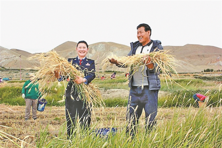圖為阿里地區(qū)稅務干部在幫農民收獲青稞。