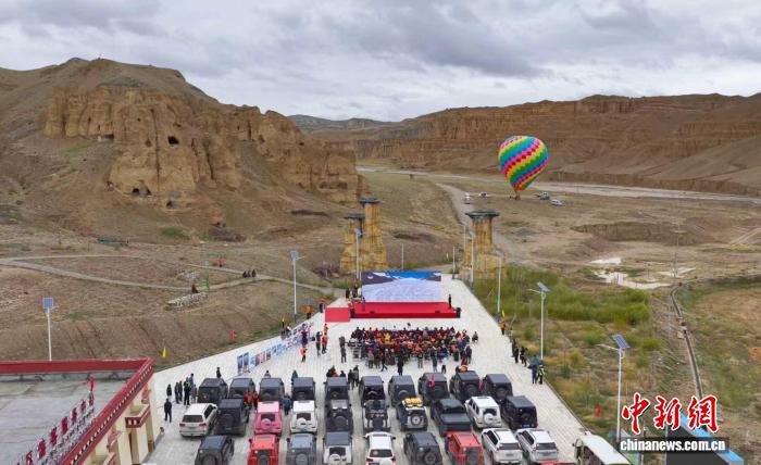 9月1日,參加“天上阿里·云巔自駕”活動(dòng)的游客在札達(dá)縣霞義溝土林景區(qū)參加開幕式(無(wú)人機(jī)照片)。閆志國(guó) 攝