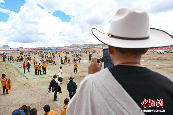 圖為當(dāng)?shù)孛癖娪檬謾C直播恰青賽馬節(jié)傳統(tǒng)大跑決賽。中新社記者 貢嘎來松 攝