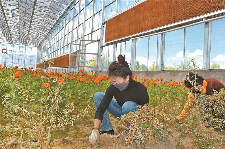 圖為在家門(mén)口實(shí)現(xiàn)就業(yè)的群眾在產(chǎn)業(yè)基地進(jìn)行田間管理。記者 丹增平措 攝