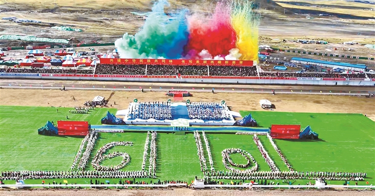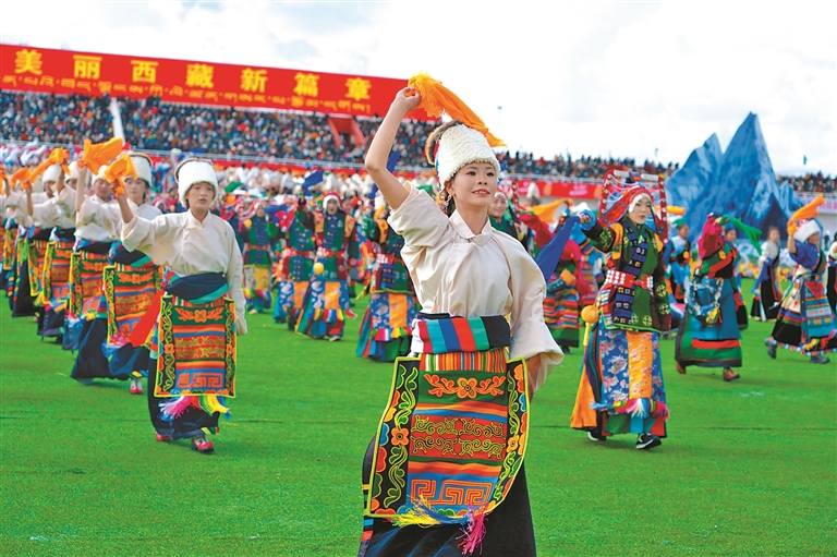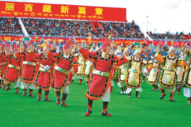 來自四川、青海及西藏本地的馬術(shù)隊英姿颯爽,躍馬揚(yáng)鞭;千人共舞《禮贊甲子》,舞步豪邁,衣袂飛揚(yáng),再現(xiàn)西藏六十年的滄桑巨變;器樂合奏《風(fēng)從浙江來·樂在那曲揚(yáng)》則巧妙融合江南韻律與草原風(fēng)情,奏響對口支援的深情厚誼;《馱鹽之歌》悠揚(yáng)響起,仿佛將人們帶回了古老的歲月,展現(xiàn)了高原兒女堅韌不拔的精神……賽馬場核心區(qū)域,傳統(tǒng)馬術(shù)與現(xiàn)代藝術(shù)在這里交相輝映,引來掌聲如潮、喝彩不絕。
