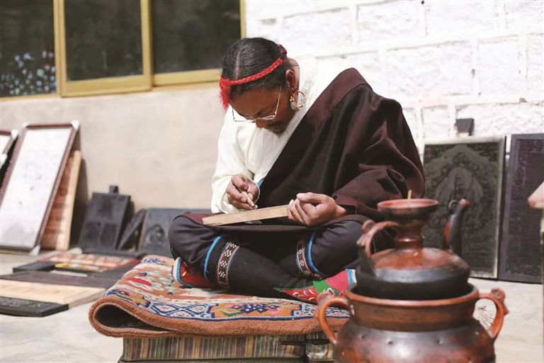 在傳承技藝的過程中,斯曲也面臨著不少挑戰(zhàn)。教徒弟時最大的困難就是讓他們靜下心來,因為這門手藝需要從小學(xué)起,不僅要學(xué)習(xí)拿工具,還要學(xué)習(xí)認字和雕刻?!耙郧肮馐菍W(xué)習(xí)雕刻文字,起碼要9個月時間,現(xiàn)在的孩子都很聰明,兩年基本就能掌握雕刻技藝。”斯曲欣慰地說。