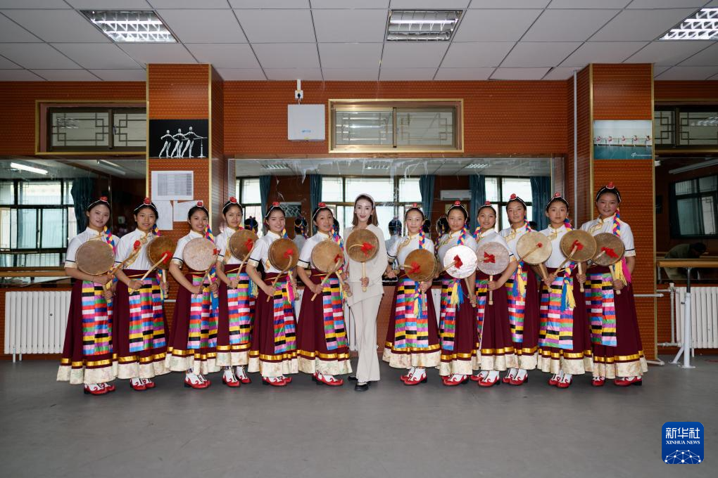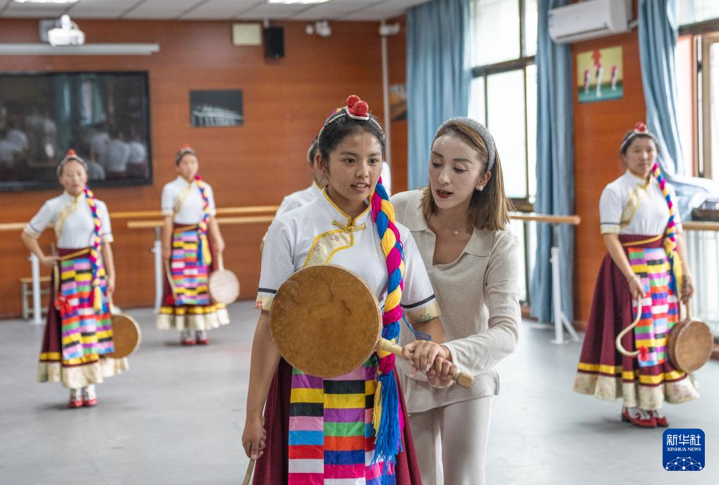 9月9日,在拉薩市第二中等職業(yè)技術(shù)學(xué)校,尼瑪卓瑪老師(右二)指導(dǎo)孩子們舞蹈動(dòng)作。新華社記者 丁增尼達(dá) 攝