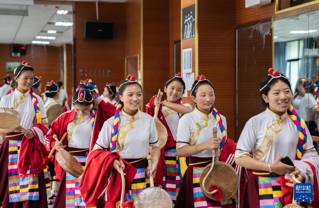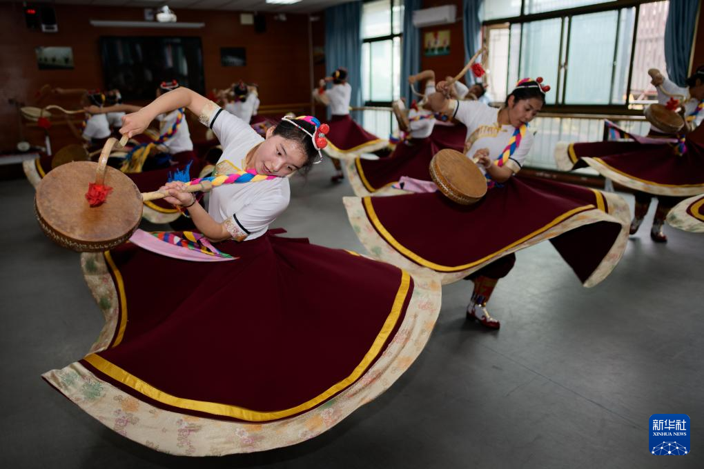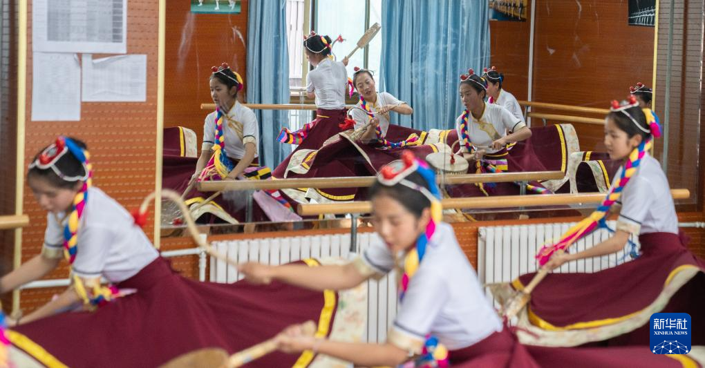 9月9日,在拉薩市第二中等職業(yè)技術(shù)學(xué)校,孩子們在練習(xí)熱巴舞。新華社記者 張笑宇 攝