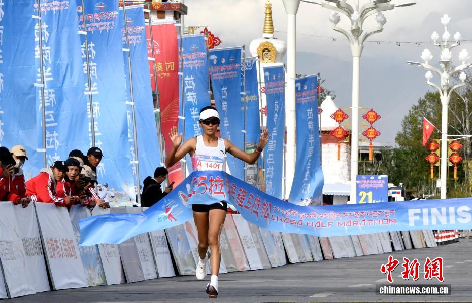 9月21日,2025拉薩半程馬拉松在西藏自治區(qū)會(huì)展中心鳴槍開跑。本次賽事設(shè)置半程馬拉松(21.0975公里)、競(jìng)速跑(10公里)和健康跑(5公里)三個(gè)組別,參賽規(guī)模7000人。圖為半程馬拉松女子組第一名央增拉姆沖破終點(diǎn)線瞬間。中新社記者 李林 攝