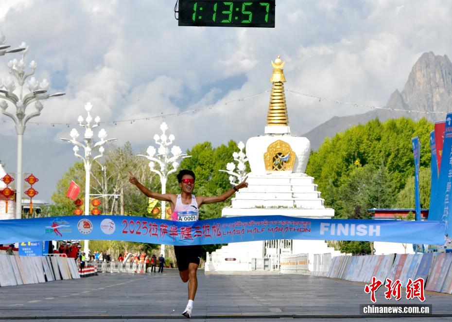 9月21日,2025拉薩半程馬拉松在西藏自治區(qū)會(huì)展中心鳴槍開跑。本次賽事設(shè)置半程馬拉松(21.0975公里)、競(jìng)速跑(10公里)和健康跑(5公里)三個(gè)組別,參賽規(guī)模7000人。圖為半程馬拉松男子組第一名頓珠次仁沖破終點(diǎn)線瞬間。中新社記者 李林 攝