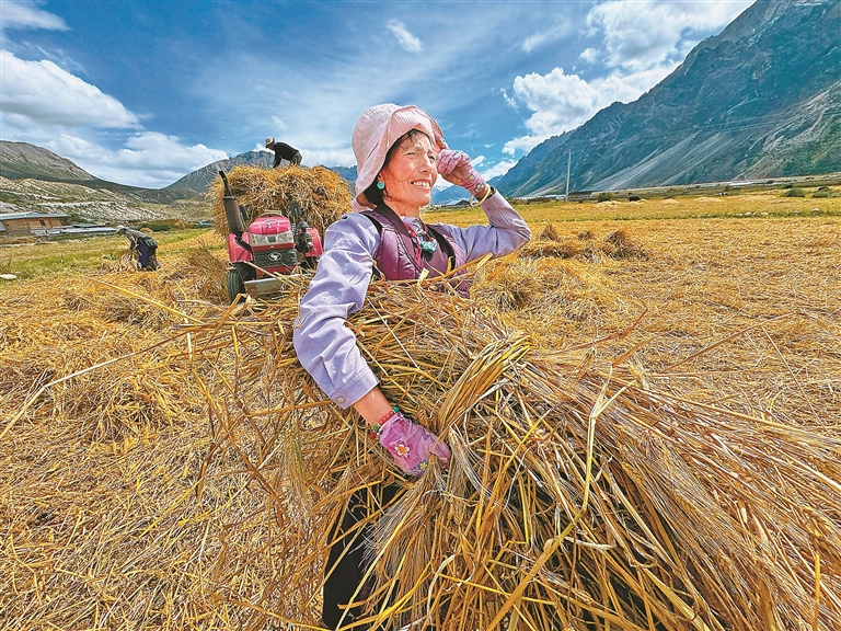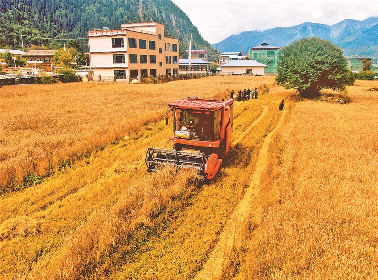 金秋的雪域高原,是一年中最動人的時節(jié)。蔚藍的天幕下,金色的青稞麥浪從山腳一直蔓延到云端。在隆隆的機械轟鳴與悠揚的勞作歌聲中,西藏各地農區(qū)迎來了豐收的季節(jié)。