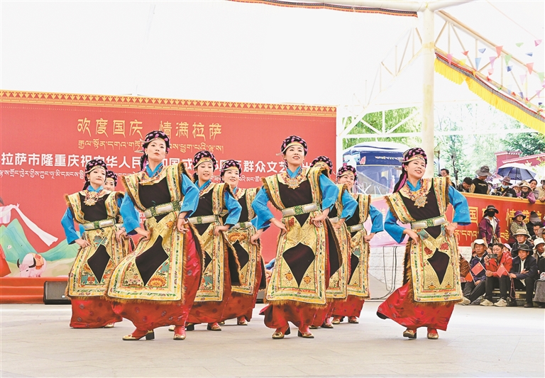 10月1日,宗角祿康公園內歌舞飛揚、歡聲雷動,“歡度國慶·情滿拉薩”拉薩市隆重慶祝中華人民共和國成立76周年群眾文藝演出在這里舉行。演出現(xiàn)場氣氛熱烈,富有民族特色的藏戲、傳統(tǒng)歌舞接連上演,歌聲、掌聲、歡呼聲此起彼伏,生動表達了拉薩各族人民對偉大祖國的美好祝愿。圖為女子舞蹈《春韻》。記者 王敏 攝