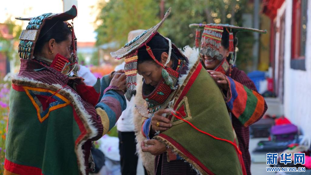 圖為科迦村村民在互相幫忙穿戴普蘭服飾(9月23日攝)。新華網(wǎng) 柑丹鴦琦 攝