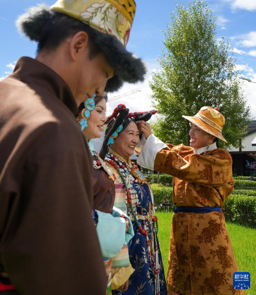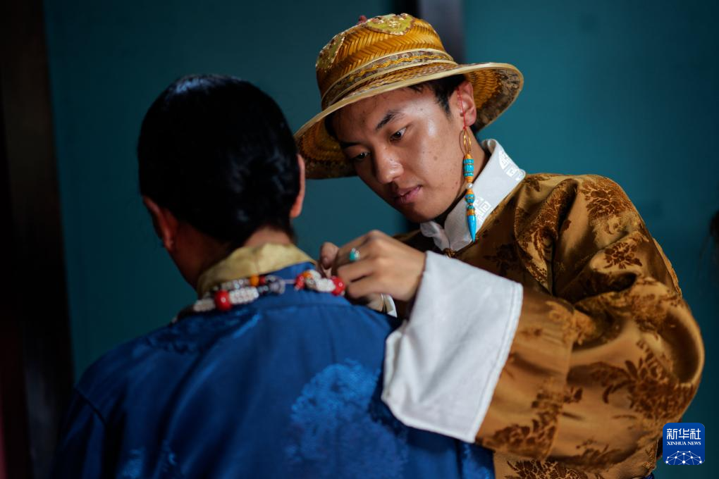 班珠丹塔為模特調整藏裝配飾(9月9日攝)。新華社記者 張笑宇 攝?