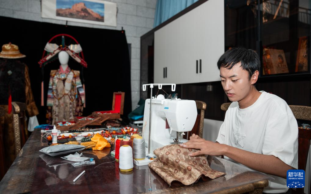 班珠丹塔在家中工作室內縫制藏裝(9月11日攝)。新華社記者 丁增尼達 攝?