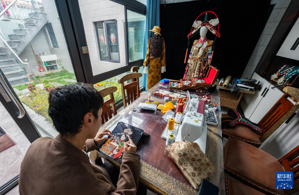 班珠丹塔在家中工作室設計藏裝(9月11日攝)。新華社記者 丁增尼達 攝?