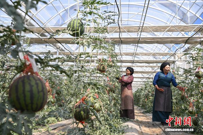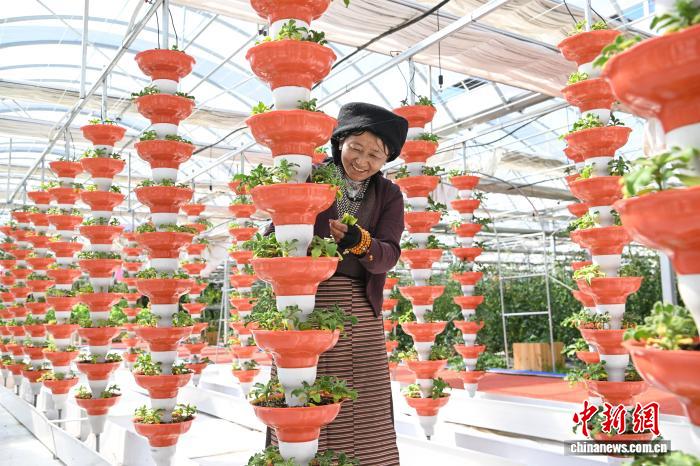 圖為當(dāng)?shù)毓と嗽谀窆たh現(xiàn)代化農(nóng)業(yè)示范園里工作。中新社記者 貢嘎來松 攝