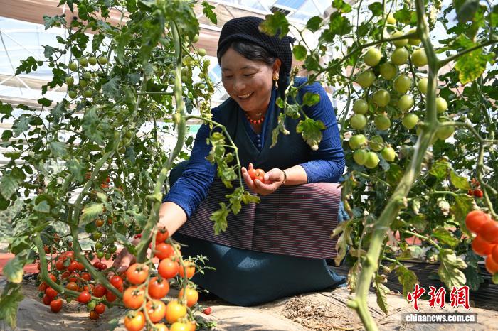 圖為當(dāng)?shù)毓と嗽谀窆たh現(xiàn)代化農(nóng)業(yè)示范園里采摘圣女果。中新社記者 貢嘎來松 攝