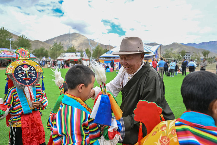 2025年7月16日,76歲的湘巴藏戲國家級(jí)非遺傳承人次仁多吉(右二)在西藏南木林縣非遺公園內(nèi)給即將表演湘巴藏戲的小演員整理服裝。新華社記者 李鑫 攝