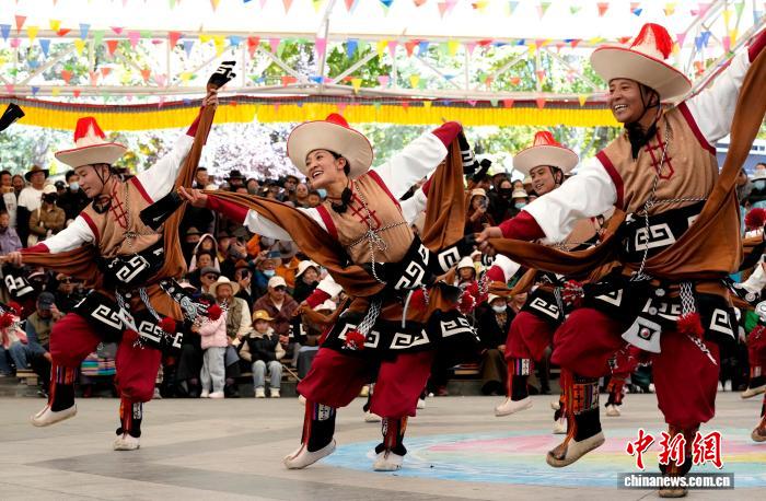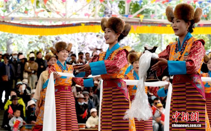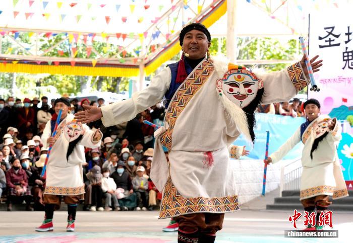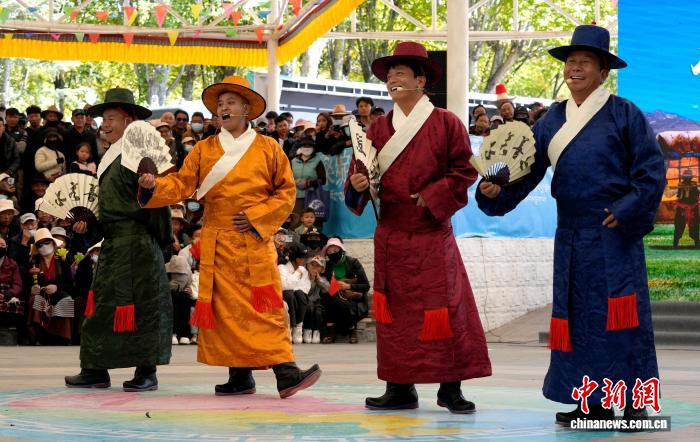 10月19日,“格?;ū崩_市第六屆縣(區(qū))藝術團文藝調演頒獎活動在布達拉宮腳下的宗角祿康公園舉行。現(xiàn)場,拉薩市各縣(區(qū))藝術團帶來精彩節(jié)目。圖為文藝調演頒獎活動上的文藝表演。中新社記者 李林 攝
